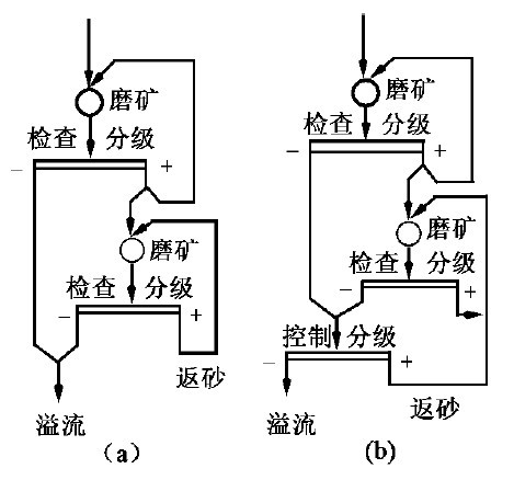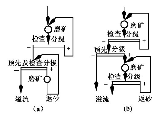 為了得到較細的磨礦產物以及需要進行階段選別時,經常采用兩段磨礦流程。進行階段選別時,第一磨礦段的產物進入第一段選別,選得精礦,其尾礦或中礦(有時可能是混合精礦或粗精礦)經第二段磨礦后,再進入第二段選別。