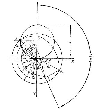 時,R=0,此方程式表示的曲線(即巴斯赫利螺線)將通過磨機中心(即極點)O。公式(2-18)代表的曲線就是諸落回點Bi的軌跡。