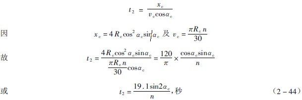 磨機一直是作圓運動的,但其中的鋼球的運動軌跡,一部分是圓曲線,另一部分是拋物線。因此,磨機轉一轉,鋼球的運動未必也就是一個循環。從圖3-2-10可以看出,鋼球從脫離點A真拋到落回點B,比圓運動快,因而鋼球總是超前的,換句話說,磨機轉一轉時,鋼球不只循環運動一次。設%"是鋼球作圓運動的時間,當磨機轉一轉時,用同樣速度作圓運動的鋼球轉過的圓心角為