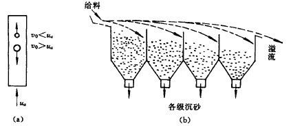 分級(jí)過(guò)程的示意圖見(jiàn)圖1(a),沉降末速大于上升介質(zhì)流速的礦粒下沉到分級(jí)設(shè)備的底部,作為沉砂或底流排出;沉降末速小于上升介質(zhì)流速的細(xì)粒級(jí)產(chǎn)物從上端溢出,成為溢流。如果要得到多個(gè)粒級(jí)產(chǎn)物,則可將溢流(或沉砂)在依次減小(或增大)的上升水流中繼續(xù)進(jìn)行分級(jí)。