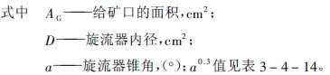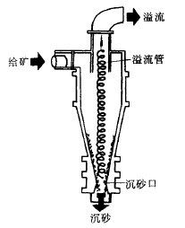 | 旋流器的構造如圖3-4-17所示。主要由一個空心圓柱體和圓錐體連接而成。圓柱體的直徑代表旋流器的規格,由50~1000mm,常用者為125~500mm。在圓柱體中心插入一個溢流管,沿切線方向接有給礦管,在錐體下部留有沉砂(或稱底流)口。 |