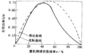 由于球荷充填率和磨機轉速率共同起作用,因此,在分析充填率的影響時也不能丟開轉速率,只能二者結合分析。磨機處于較低轉速時,球荷在磨機內形成一個傾斜面,球升到高處時沿球荷斜面滾下,形成瀉落運動狀態。隨著球荷充填率增加,球荷傾斜面角度增大,球荷下滑力矩增大,球磨機需用功率也增大,按戴維斯和列文松等人的理論,球荷充填率達50%時磨機功率達較大值,如圖3-5-5所示。當充填率超過50%時,磨機功率開始下降,這是由于球荷上升過高,球向下滾動時落回點也高,又將能量傳回筒體,故磨機實際需要的功率下降。當球荷充填率為100%時,整個磨機實際上成為一個滾筒,磨機只需維持此滾筒轉動需要的能量,因此磨機的功率很低。如果磨內裝有礦石和水,磨機功率的實際曲線(圖3-5-5中實線)與理論曲線(虛線)產生差異,達到較大功率的充填率值下移,這是由于礦石和水的加入使球荷實際充填率上漲之故。