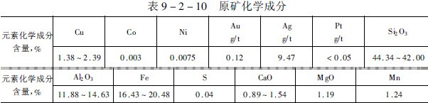 該礦屬于石英閃長斑巖與石灰系灰?guī)r接觸交代矽卡巖銅礦床。礦石呈土狀,氧化程度較深。由于成巖階段次生富集作用,銅液擴散推移過程中與硅、鐵和鋁的鹽類及其氧化物形成結(jié)合性氧化銅,覆蓋于表面及間夾于孔雀石類型礦石中。含銅礦物以孔雀石為主,有少量藍銅礦、硅孔雀石和水膽礬等。鐵的礦石主要為褐鐵礦,磁鐵礦和亦鐵礦次之。脈石除鐵質(zhì)粘土外,還有石英、云母、石榴子石、角閃石、蛇紋石、綠泥石和方解石等。原礦中鐵質(zhì)粘土含量很高,-200目高達48%,礦石含水27.1%,較大塊的礦石300毫米左右。原礦物質(zhì)組成列于表9-2-10和表9-2-11。