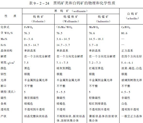 白鎢礦(CaWO sub 4 /sub )是鈣鎢酸鹽,結晶呈正方晶系,鉬可能取代白鎢礦中的鎢,而形成一種類質同象的鉬酸鈣(CaMoO sub 4 /sub )礦。白鎢礦在紫外線輻射感應下,發出鮮明的藍白色熒光,當礦物中有鉬存在時,會改變熒光的顏色,隨著鉬的含量增加,逐漸由藍色變為米色,淡黃色或橙色。表9-2-24是黑鎢礦類和白鎢礦的物理和化學性質。